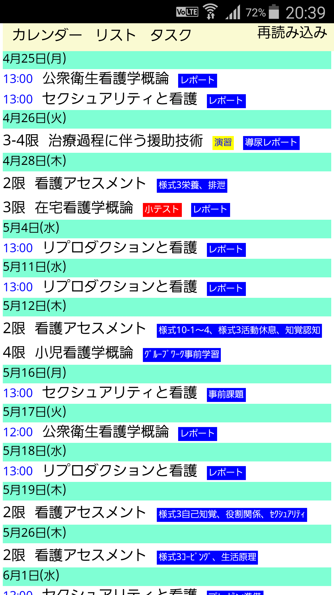 リスト表示(時系列で差し迫る授業(時間割)と試験と課題が確認できる)、
