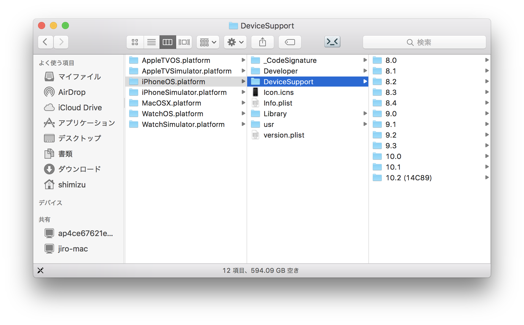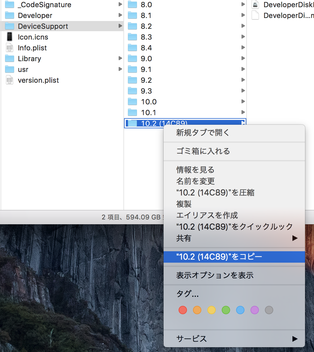 ここに確認したいiOSのバージョンのフォルダがあるのでコピーします。