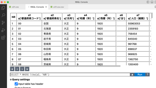 コマンドパレットで「RBQL」と実行すると、SQLで検索したりグループ化、並び変えができます。
