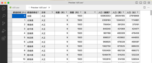 ただ、VSCodeでCSVを開くと、文字のトラブルはなくなるものの、お世辞にも見やすいとは言いづらい…