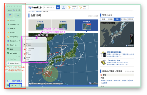 Arc は、そのアドレスバーとタブが、ウィンドウ左側にサイドバーとして配置されています。