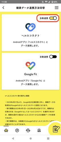 アスマイルの場合は Google Fit からヘルスコネクトへの移行期間は、どちらと自動連携するかを選択することができます。