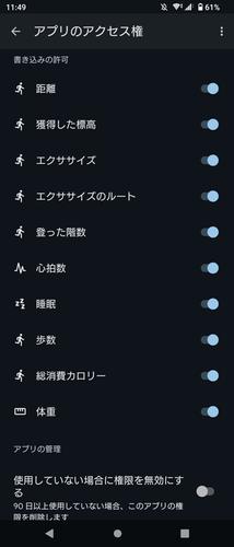 Fitbit からヘルスコネクトへの書き込みはすべて許可した上で、読み取りはチェックを外しておきました。