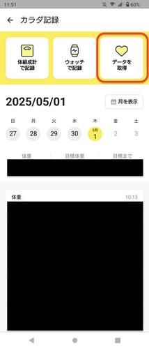 カラダ記録 → データを取得 でヘルスコネクトからカラダデータを取得することができます。