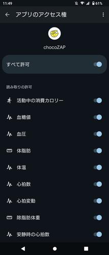 chocoZAP やアスマイルは歩数や睡眠の情報を読み取りたい、と求めているので「すべて許可」します。