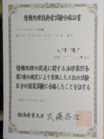 ようやく「紙」の合格証書を(郵送で)受け取りました。