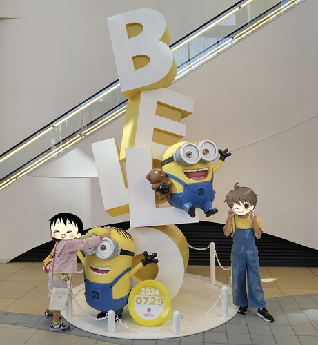正面玄関ではミニオンのモニュメントがお出迎え。子どもたちはすでにテンションMAXです。